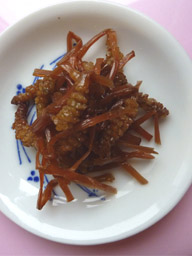 胞子が開いて、緑っぽくなっていたので、キッチン鋏で色の濃いのをとってから佃煮にしたら・・・