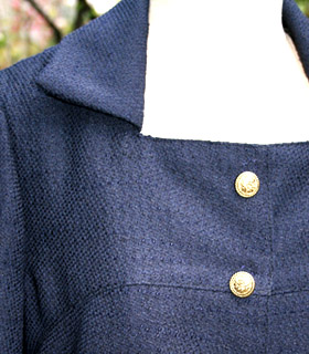 胸で切り替えた、少しふんわりとしたデザイン。最近はすこし大き目のスナップボタンに飾りボタン、というのが流行っています。