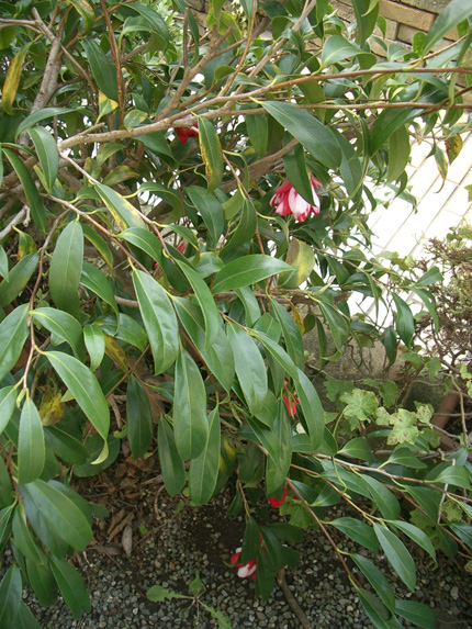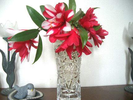 この椿は今は閉店してしまった駅前の花屋さんで買いました。アバウトな花屋さんでバラはどんな色でも形でも、札には「バラ」としか書いてありませんしつつじは「ツツジ」とだけ、椿も然り・・です。どんな色なの?と尋ねても「咲いて見なきゃわかんないさ。」といいかげんなおじさん。