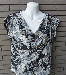 でもこのデザイン、たっぷりのバイヤスドレープがスカーフのように見えて、なかなか便利なんです。ジャケットのインナーにもよさそう。