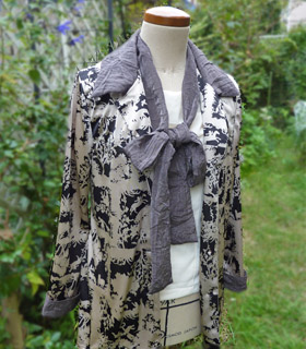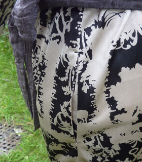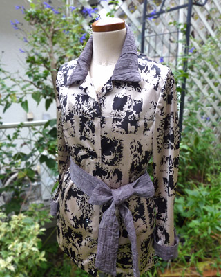 模様が賑やかなので、首周りはシボのあるオーガンジーにしました。これでぐっと引き締まり、おしゃれになりました。もちろん脇にポケットありです。