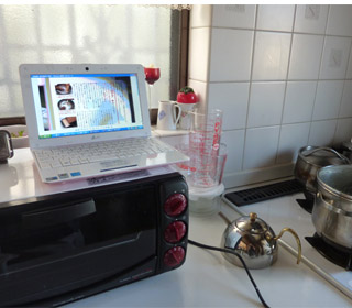 調理台にあるデロンギのオーブンの上にネットブックをのせて、レシピを見ながら料理をしています。インターFMで音楽も聴いているので、快適!
