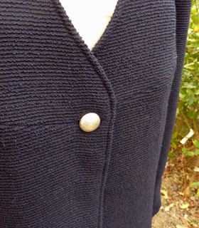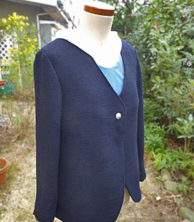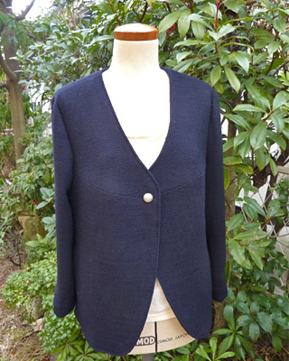 素材は100パーセントウールのニット。ネイビーブルーの襟なしジャケットです。