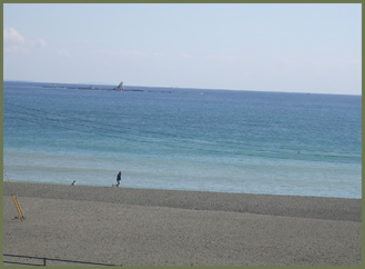 レストランの駐車場から見下ろした海です。冬は水も空気も澄んでいるので白い砂浜が透けて見え明るいエメラルドグリーンにきらめく海・・・あれっ、茅ヶ崎海岸ってこんなにきれいだったっけ?