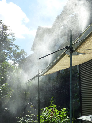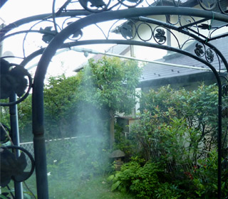 ガーデンクーラーといって、よく駅の広場や歩道にある、霧をだすチューブです。