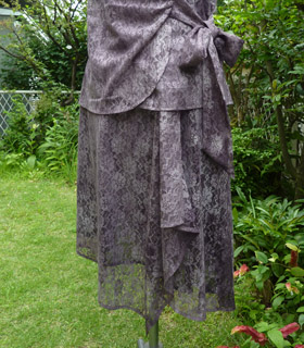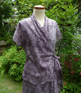 レース地でカシュクールを作ると、FIFTIES にぴったりのブラウスになりました。これはベルトは巻きつけないで、内と外でそれぞれ結わいてます。さらりとシンプルなデザインが、レースを引き立てて、おしゃれ。?素材はナイロンのむら染め。