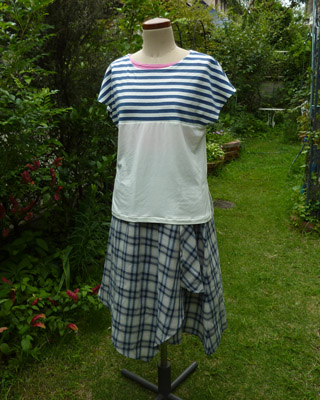 このスカートはウエストゴムですが、ちょっとした仕掛けがあり、着易いのにすっきりウエストになりました。いろいろ着まわしていただけますよ。