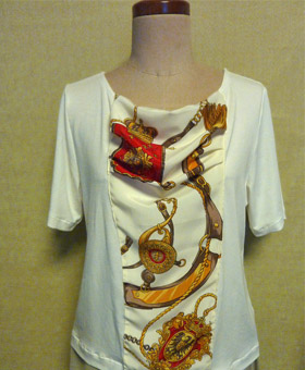 スカーフそのものというより、クラシックなスカーフ柄をモチーフにしたブラウスや小物など・・かしら?