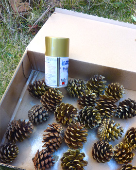 茅ヶ崎の防砂林の松林で拾ってきた松ぼっくりに金色スプレーをシュッ!
