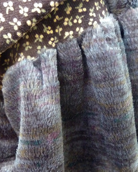 素材はポリエステルのベロア。ふわっとした濃いグレーのなかにそれとなく赤や青や黄色の線が入っていて、深みのある色です。