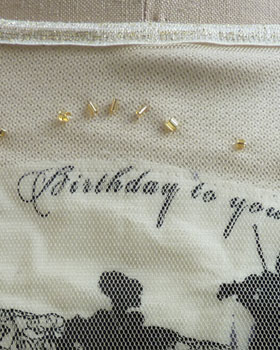 継ぎ目にゴールドの細いレースをたたき、ゴールドのビーズも散らしたら、