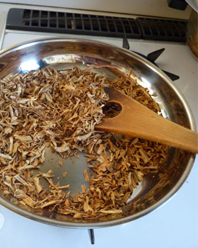 フライパンでカラ炒りして、手でほぐすとぱらぱらと砕けたら出来上がりです。