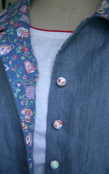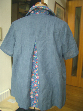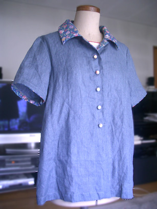 ブラウスのパターンは以前作ったハウスコートと同じですが青い麻地で地味なので襟や見返しにはアメリカンコットンを使いました。
