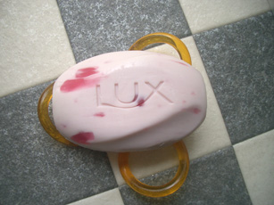 先日ドラッグストアのワゴンでティッシュと一緒にラックスの石鹸が並んでいました。キャットウーマンのようなこわそうなオネエサンのパッケージが気に入って値段も激安だったので買ってきました。家に帰って開けてみたらなんとこれが薄ピンクのせっけんにハイビスカスの透明せっけんを散らしたコンフェティ。