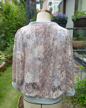 素材はポリエステル、基本色はくすんだピンクですが、むら染めなのでグレーや白いかがり糸、かすかなラメ、と華やかでも派手すぎず、実はとても上等なレース地です。