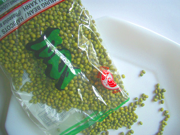 思いついたらすぐにでも煮えて味はあずきに似てます。アジア食材の店や製菓材料の富沢商店などにあります。私が買ったのはタイ産のもので400グラムで200円くらいでした。安いですね。お米にほんの少し混ぜて炊いたり、スープに入れてボリュームを足したりと大活躍なので私は台所に常備しています。今日みたいに暑い日はお汁粉をたっぷり作って冷蔵庫で冷やしておいて「夏バテのおくすり」と称してちょこちょこ食べてます。もちろんこれで立派な「自家製もやし」を作ってもいいんですよ。
