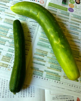 普通のきゅうりの4倍ほどのオバケきゅうり。