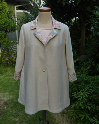 あんまり気に入ったので、ポリエステルとシルク素材で2枚自分用に作ってしまいました。 家用に作ったのですが、素材がよそ行きっぽかったので、カタログ用には動きのラクなニット素材とコットンプリントにしました。