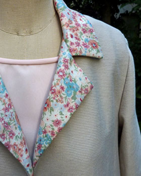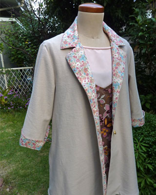 素材はコットンポリエステル混紡のニット素材。 ベージュ色の身頃に花模様のコットンの生地を衿に合わせました。