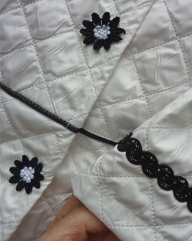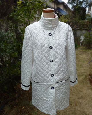 スナップ留めなので、表地のボタン位置にモノトーンのレースも縫い付けてみたら、とてもご近所ワンマイルウエアー(ぼろかくしコート)とは思えないほどの出来栄え。