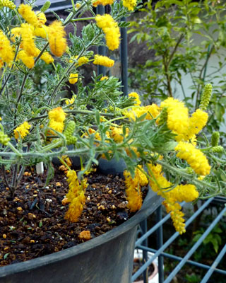 以前のミモザは銀葉アカシアでまん丸でしたが、今日買った「アカシアモニカ」は少し細長。でもふわふわ花は同じです。