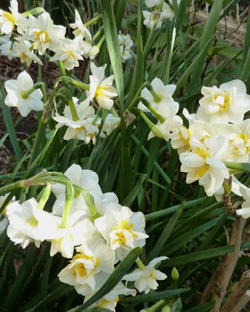 急に暖かくなったので庭に出てみると、すでに木々には新芽が息吹き、雑草もそこここに顔を出し、水仙も満開で春へとまっしぐらでした。
