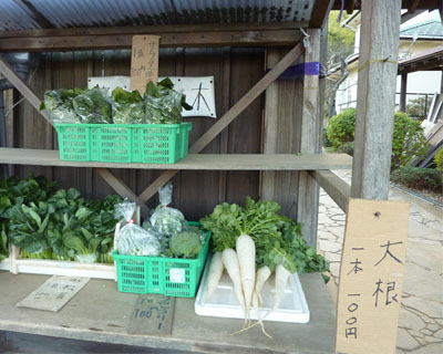 門の脇で採れたての野菜を販売しています。