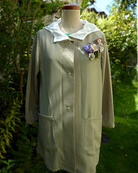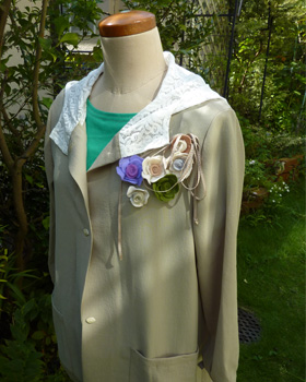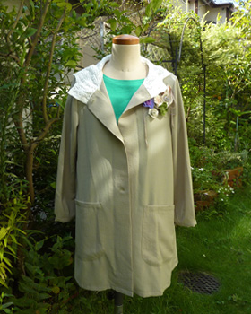 「夏のなごりのバラ」を取り合わせ良く胸元の飾りにしたコート、初夏に制作した同じ型紙から、初秋にピッタリのお洒落コートが完成しましたね。