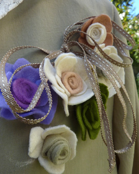 すべてアースカラーでまとめて、気持ちまで枯葉モードにならないようにね。 今回バラの花はひとつひとつ、裏から安全ピンで留めてあります。 気分によって、またはお洗濯の時にはずせるように。