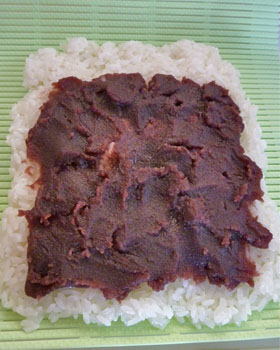 もち米のうえに市販のこしあんをぺたぺた塗って