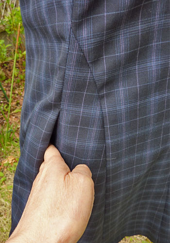 素材はさらっとした、ウールとポリエステルの混紡で、チャコールの地色に水色とピンクの細い線の格子模様。ほとんど無地感覚の張りのあるジャケットウールです。