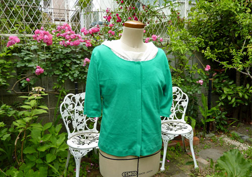 フードはお洒落演出と実用を兼備えた優れ物です。それが貴女の手にかかるとジャ?ン、素敵な初夏のカーディガン。