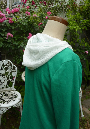 明るすぎて又は暗すぎて残っている生地も服のカタチにすると印象がかわります。 これはちょっと派手なグリーンですがこの際もっと派手にレースのフードをつけて好きなデザインにしました。
