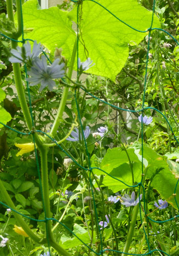 チコリは毎朝、青い花を20個ぐらい咲かせて目を楽しませてくれます。