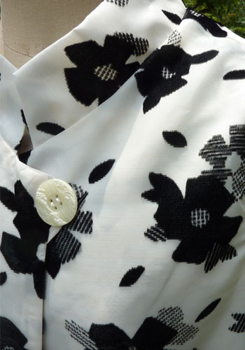 素材はポリエステルの白地にベルベットの黒い花模様が散らしてある、ほんのり透けてエレガントな生地です。