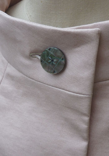 ボタンは角度によって黒にも虹色にも見える貝ボタン。