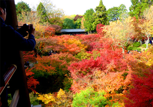 東福寺の通天橋。あちらの橋もこちらからも人がこぼれ落ちそうなほどぎっしり・・・