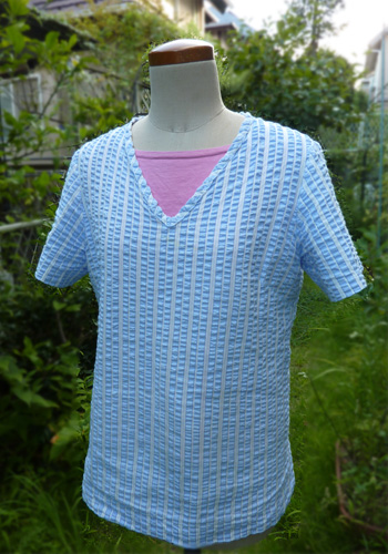 綿麻のサッカー地で、襟ぐりがVネックなのでそのままかぶって着られます。