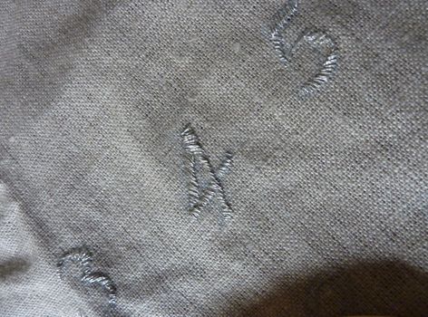 グレーのリネンに銀糸で刺したら、全く見えなくなってしまったのです。色を替えて作り直します。