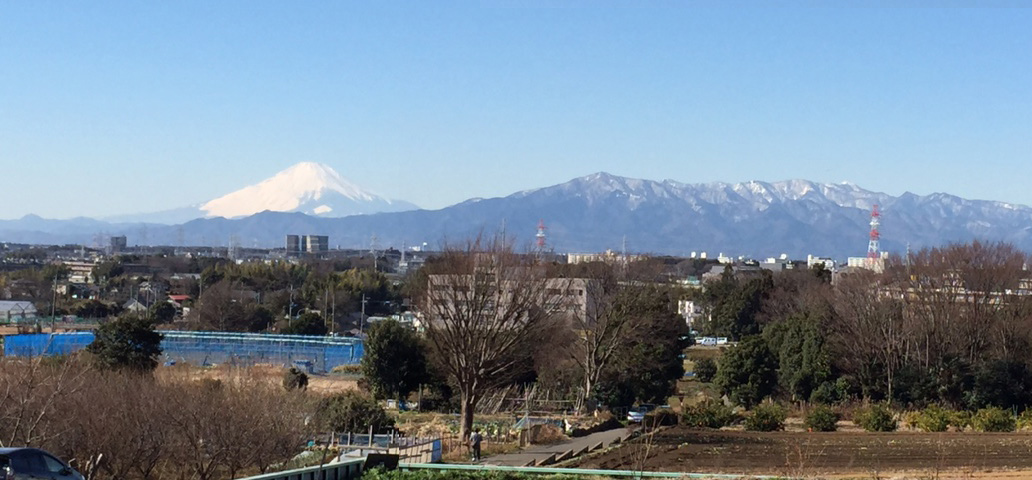 近所の丘から見た富士山。今日のように寒い日は大山、丹沢、富士山と遠近がクッキリ。