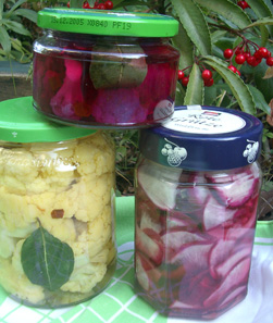 色んなピクルスが食卓に並ぶと、目にとってもご馳走ですね。 たまに帰って来る息子は我が家の料理は茶色が多いとぬかしてくれますので、これからはスウィティーさんを見習ってリベンジします! バナナ酢のレシピも有難うございました♪
