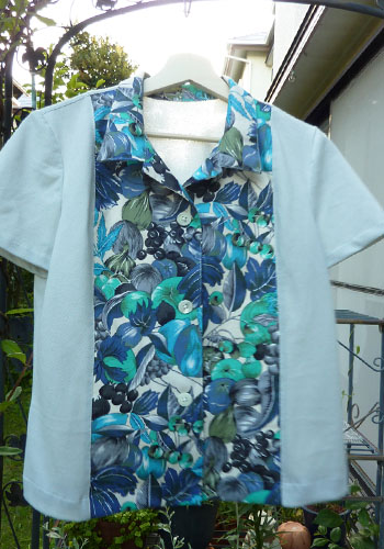グレーの鹿の子のポロシャツ地に青のプリントを合わせました。