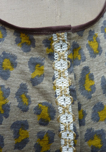 素材はコットン、アニマル柄で前立てにレースを貼りました。