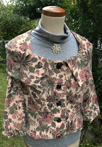 このジャケットでしたら下はタイトなスカートが一番合うのでしょうが、上下ばっちり決めてしまうとコスプレっぽくなってしまうので、かえってパンツなどが今風でしょうか。