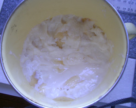 ジェル状やクリーム状になったら出来上がり。私は味噌入れに入れて、さらに料理で使ったレモンの皮を時々入漬け込んでます。石鹸はアルカリ、レモンは酸性なので合わさると化学的にはどうなるのかわかりませんが、何ヶ月もカビもせず、いい具合です。