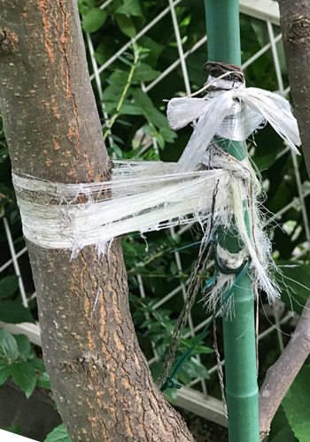 今年我が家では柿の樹の支えに結んだスズランテープ(ポリひも)が小鳥たちに大人気。
