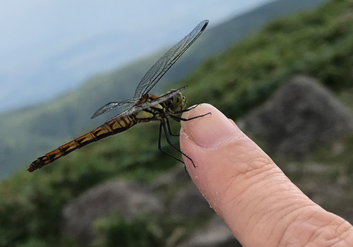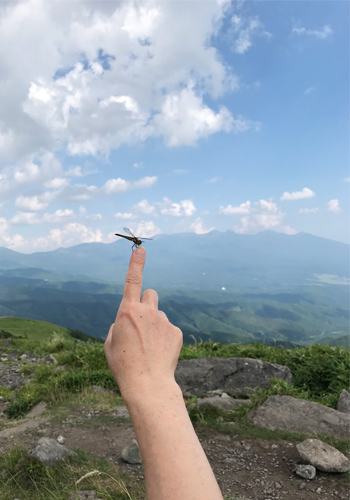 静かに羽を震わせる振動が伝わってきて、大自然の中でトンボとちょっとだけ心が通じた気分でした。