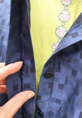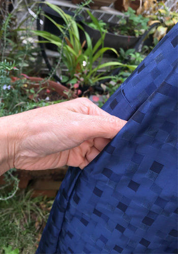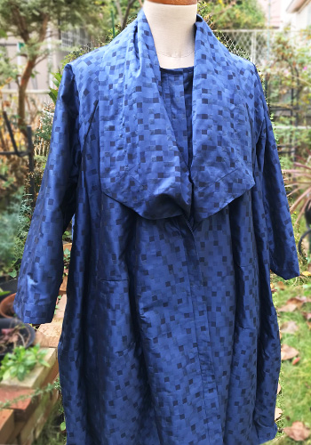 色はネイビーブルーですが、ツヤのある生地のところどころのブロックが黒っぽかったり、透け感があったりと、薄くてハリのあるシルクのように美しい生地です。