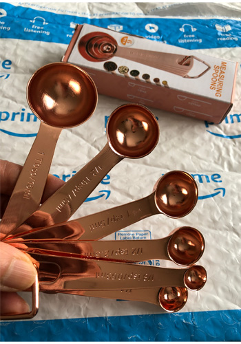 以前ナイジェラ ローソンの料理番組を見ていたら、ピカピカの銅の大匙小匙がとてもきれいで欲しくなりました。