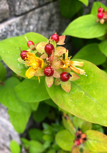 黄色い花が咲いた後すぐに赤い実がつく ヒペリカム。